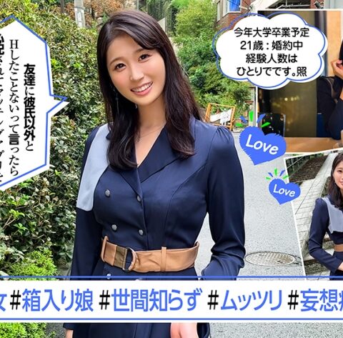 現役大学生でありながら、すでに結婚を決め、現在婚約中のふーみん・21歳。男性経験は婚約者1人のみ!! 男性経験の無さを周りの女友達から心配され、紹介されたアプリで本日マッチングデビュー。汚れを知らない真面目で素直な純朴種です。婚約者とは仲が良く、特に不満はないが女友達に言われてから、男性経験1人のまま結婚するべきか悩み続けているという。カフェから居酒屋へ移動し、お酒が回ってきたところでホテルへ誘導。緊張と恥じらいが隠せてませんがマ○コはすでにグチョグチョ 笑。彼女にとってはすべてが新鮮で未知なエロ体験のようです。リアクションが初々しくて可愛すぎ!! アソコの形が彼棒から他人棒に変わってしまうか心配している彼女でしたが緊張しながらも人生で二人目のチンポを挿入!! 挿入後の期待以上のポテンシャルはぜひ映像をご確認ください。2回戦で、一生懸命、奉仕してくれる姿はさらに愛おしい。素直に感じてくれるエロさ、イキっぷり、かなりイヤラしかったな~。結婚するまでで良いから、セフレになってほしい…そんな魅力あふれる女性でした♪