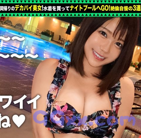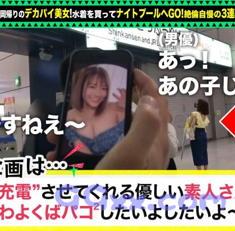 「充電させてくれませんか?」と優しい美女にお願いして、スマホを充電させてもらいつつエッチな充電もしちゃうスケベ企画。今回充電器を貸してくれた女神は、めいちゃん!静岡帰りでお土産を両手にたくさん持っていましたwお土産の中のパイを見せてもらったのですが、我々は別のパイに釘付けです。私服から露出が激しいですねw水着がほしいという話を聞き、充電のお礼に買ってあげることに!購入後はもちろんナイトプール!!あいにくの雨でしたが、人が少ない分めちゃ楽しく遊べました!そしてそのままホテルへ直行。楽しく雑談をしていると、大きすぎる胸にコンプレックスがあったと判明。国宝級のHカップにコンプレックスを感じる必要ないですよ!別の意味で感じてもらい、克服のお手伝いをしちゃいましょう♪脱がすと、ぷっくり乳首もキレイな美巨乳でした!超柔らかい!!お尻も肉厚!上下どちらも揉み甲斐がありますねぇ~!手マンでほぐすともうびちゃびちゃwマン汁溢れるわ潮吹くわで一面水浸しですwwwもう準備完了ぽいので挿入れちゃいます♪床やソファでエンドレスピストン!壊れるくらいの喘ぎ声がチ●コにキますね!!もちろん中出し→シャワーの鉄板ルート!シャワー中もパイズリしてもらい、おっぱいにセカンド射精!下着に着替えて正式な2回戦を開始します。薄ピンクの清純ランジェリー!!その姿にふさわしく、正常位でいちゃいちゃ拘束&高速ピストン!そしてお口に大量射精!絶倫対決は引き分けで終了にしときますかw
